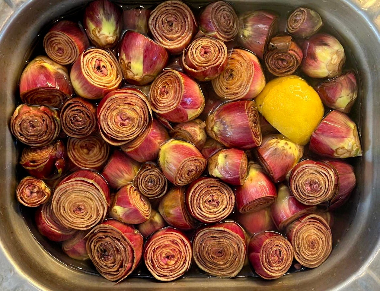 Remove the choke with a teaspoon, then cut each artichoke vertically into eight segments. Drop immediately into a bowl of cold water with lemon juice.