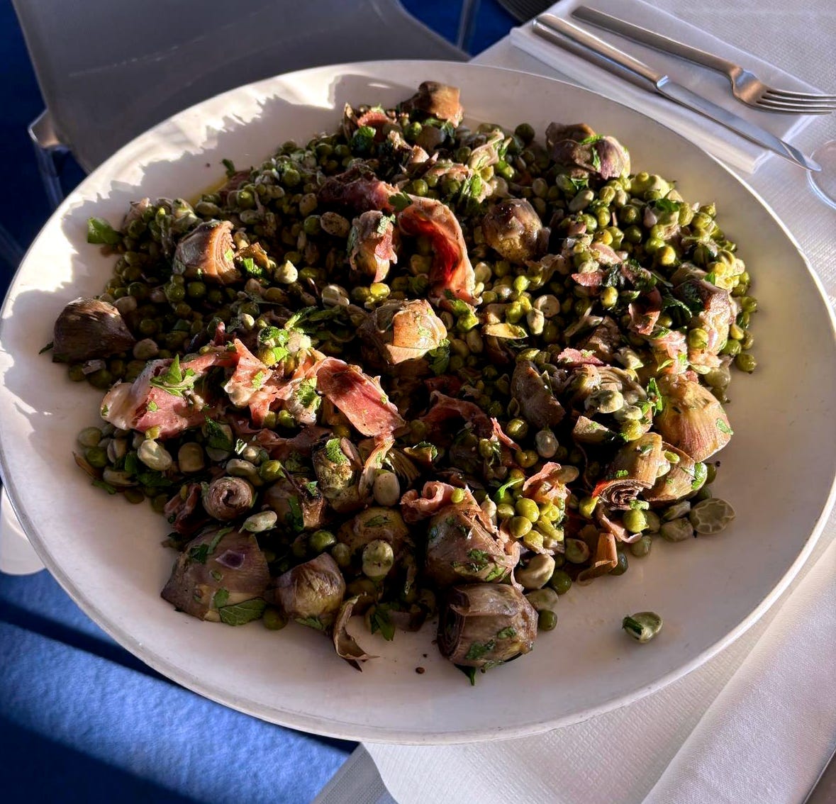 When spring arrives at The River Cafe, we make vignole. Think of it as a Roman vegetable stew, though as executive chef Sian Wyn Owen says, “I’m not a fan of the word stew. I would describe vignole as an assembly of the most exciting ingredients of spring—peas from the pod, tender broad beans and carciofini, the baby artichokes from the market in Milan.”