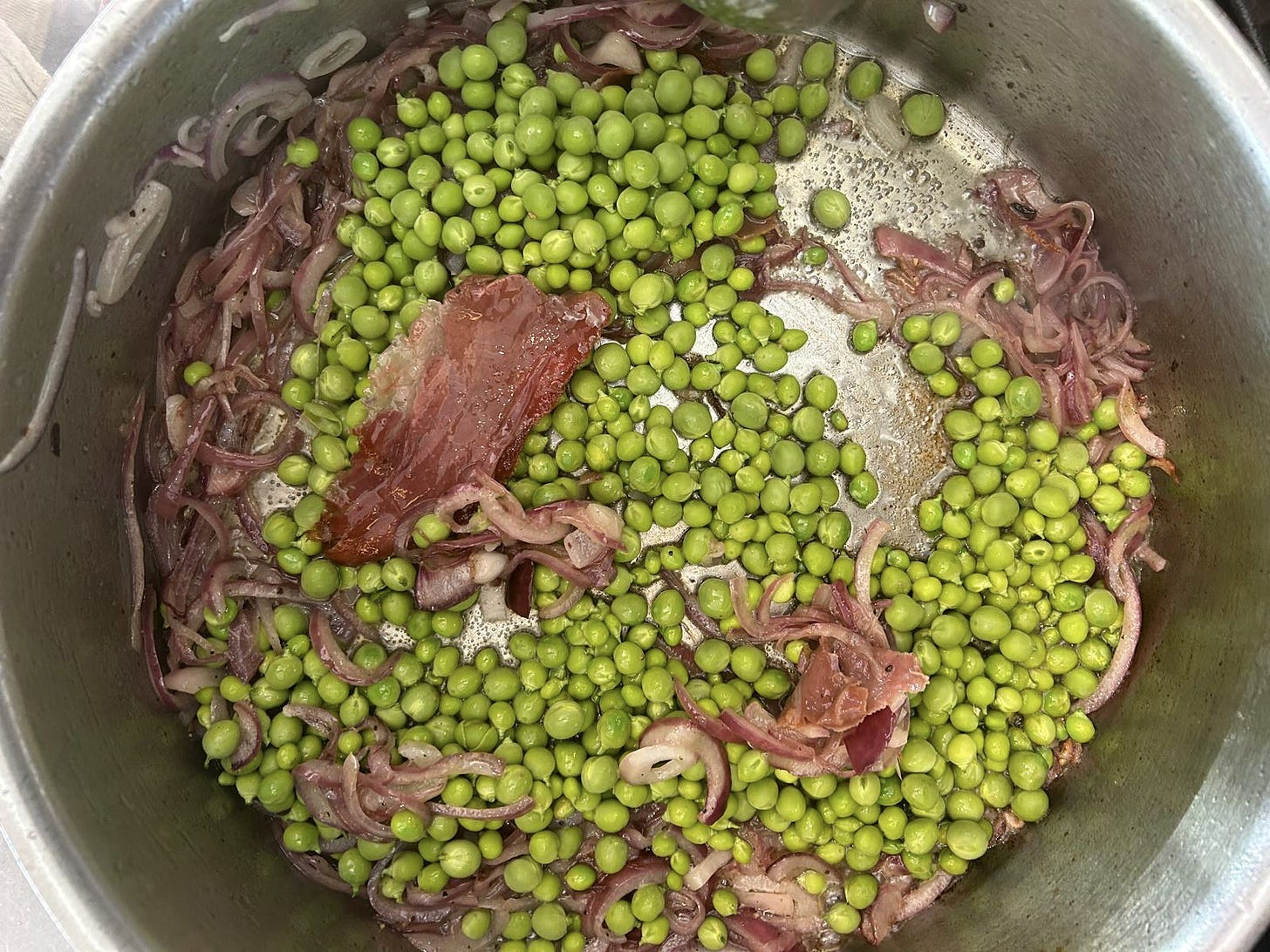 Once all the vegetables are prepped, we cook spring onions and sliced garlic in olive oil over a low heat until they are soft but not brown. We add the peas and broad beans in equal measure along with the artichokes. We stir them together and add just enough light chicken stock, vegetable stock, or even water, to cover.
